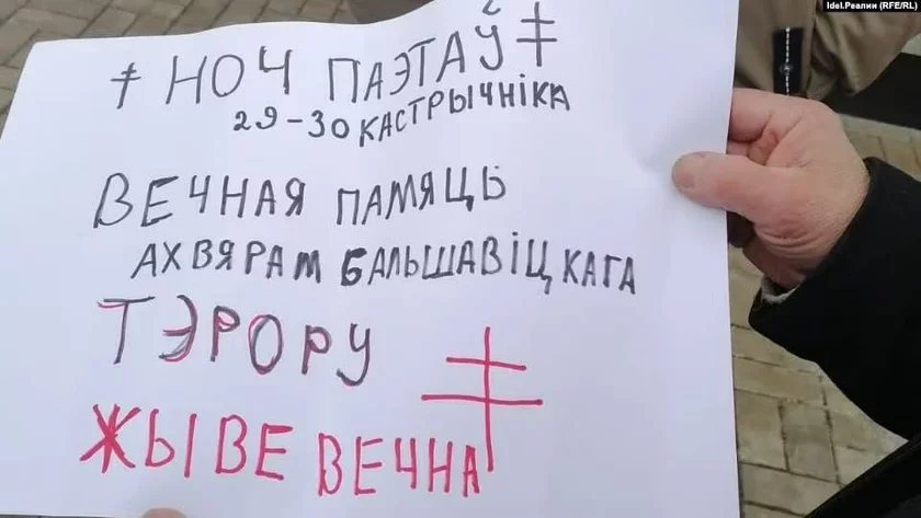 В этот момент сотрудники полиции подошли к одному из них — Кириллу Войтовичу. Молодого человека задержали за небольшой плакат на белорусском языке: «Ноч паэтаў. 29-30 кастрычніка. Вечная памяць ахвярам бальшавiцкага тэрору. Жыве вечна».