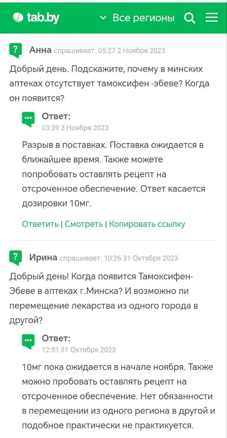 «Я была готова на это, потому что мой запас «Тамоксифена-Эбеве» должен был закончиться в течение недели. С помощью сервиса tabletka.by я нашла лекарство в нескольких аптеках в Гомеле. Но когда стала звонить туда, то услышала, что ехать особого смысла нет, так как они могут отложить таблетки максимум на два часа, а очевидно, что я не успею из столицы так быстро приехать. Посоветовали обратиться в «Белфармацию».