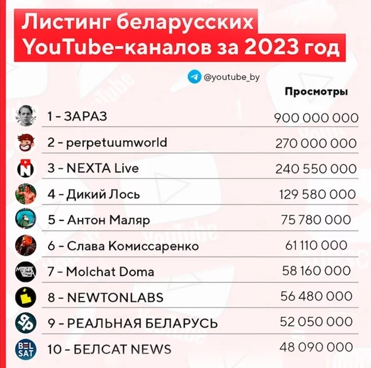 Телеграм-канал «Youtube Беларусі» составил топ белорусских каналов 2023 года по просмотрам. В первой десятке есть те, о которых вы могли не слышать — рассказываем о них подробнее.