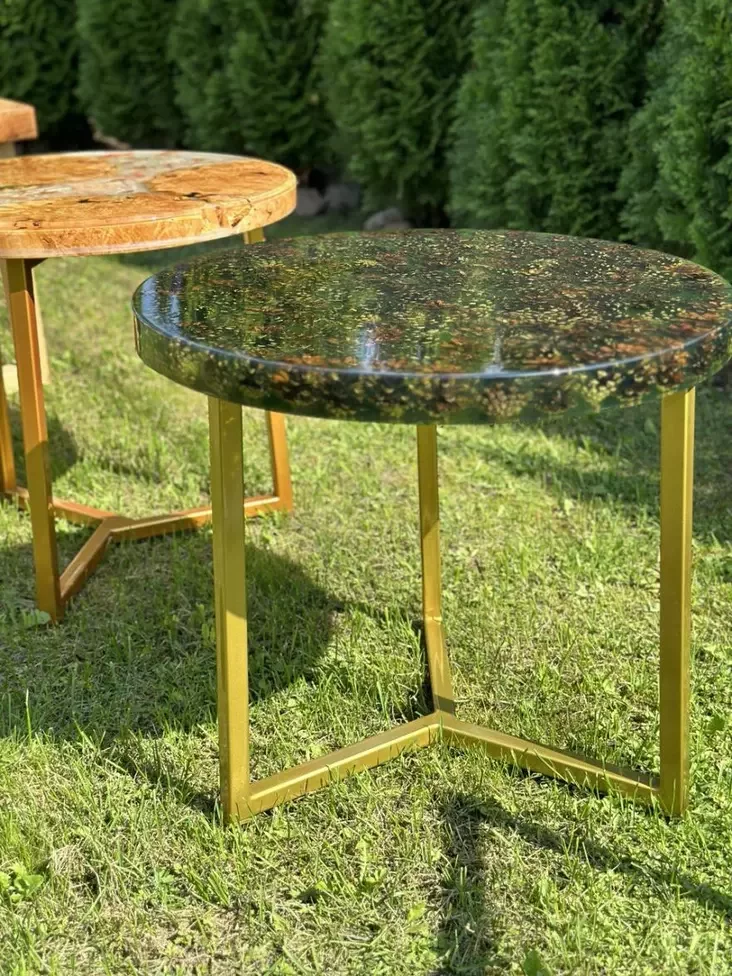 Древесные недостатки, такие как трещины и узоры, заполняются эпоксидной смолой разных цветов, что позволяет создавать разнообразные эффекты и текстуры. В конечном виде получаются красивые предметы интерьера.