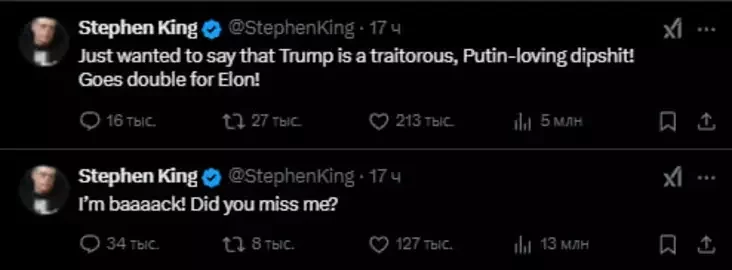 «Просто хотел сказать, что Трамп — предательский, любящий Путина дурак! Илона это касается вдвойне!», — написал Стивен Кинг.