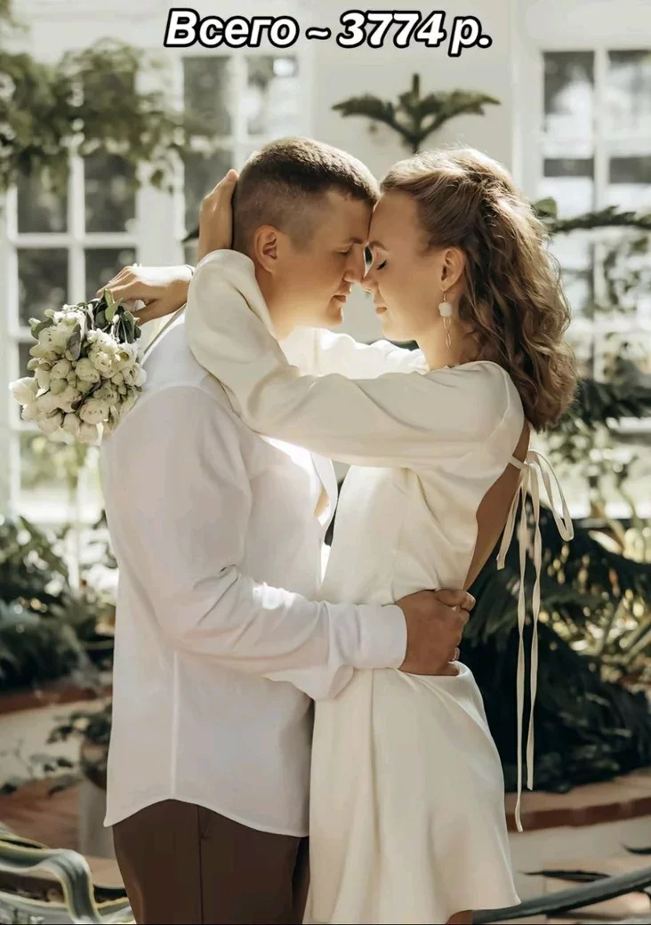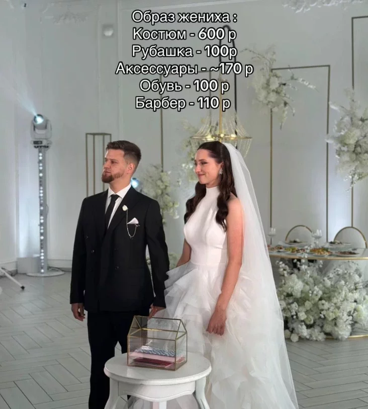— Образ жениха собирали на «Вайлдберриз» и в «Спортмастере». Вместе вышло 759 рублей. Образ невесты — платье, туфли, сменные босоножки (чтобы ноги на каблуках не устали), сумочка — 1265 рублей.