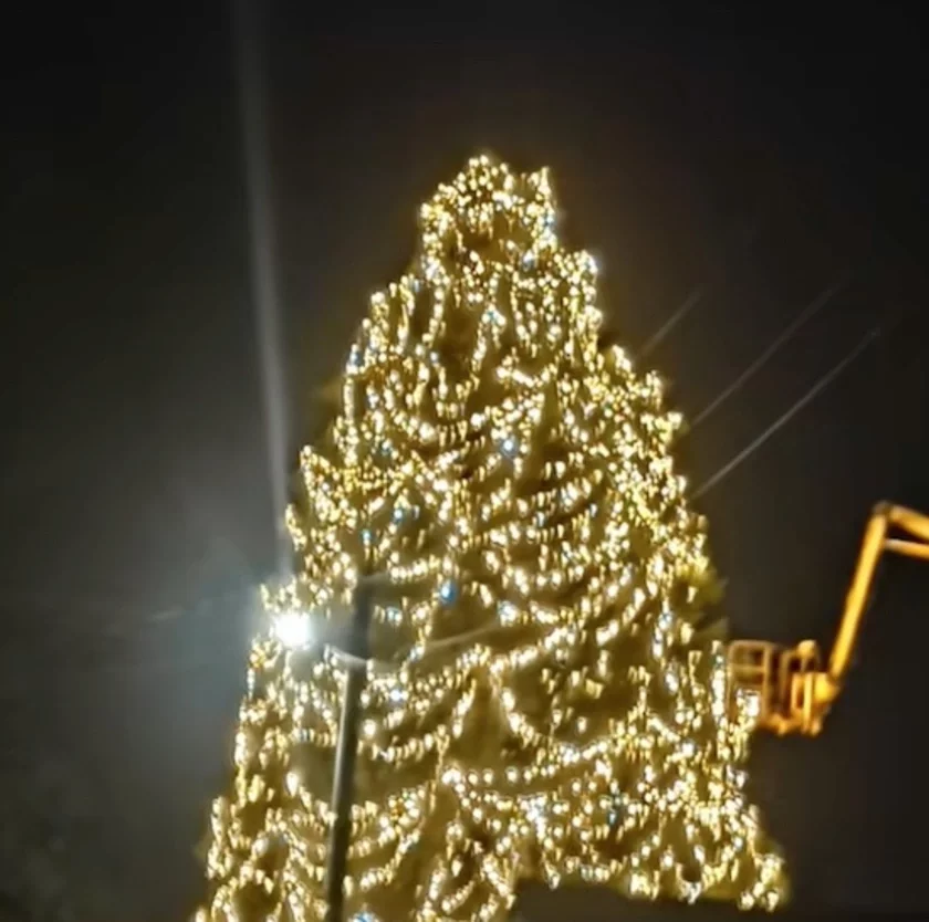 По словам собеседника, на елку высотой в 24 метра ушло 2 тысячи метров гирлянды и 20 тысяч лампочек. Чтобы ее украсить, пришлось задействовать вышку и трех человек, включая профессионального альпиниста. Работа кипела три дня — с 26 по 28 сентября.