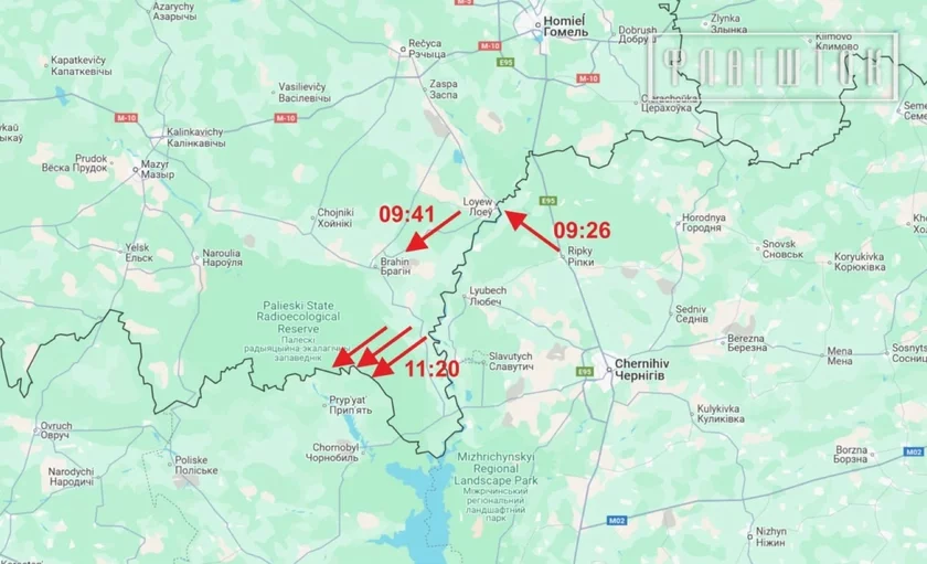 Первый в 09:26 пролетел через украинские Репки в направлении Брагина и далее Лоева, сообщает «Флагшток».