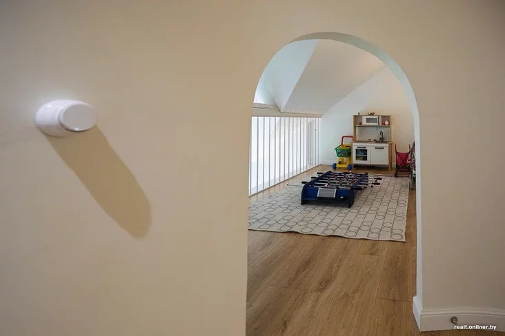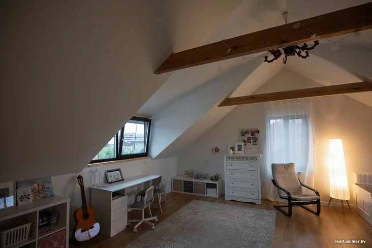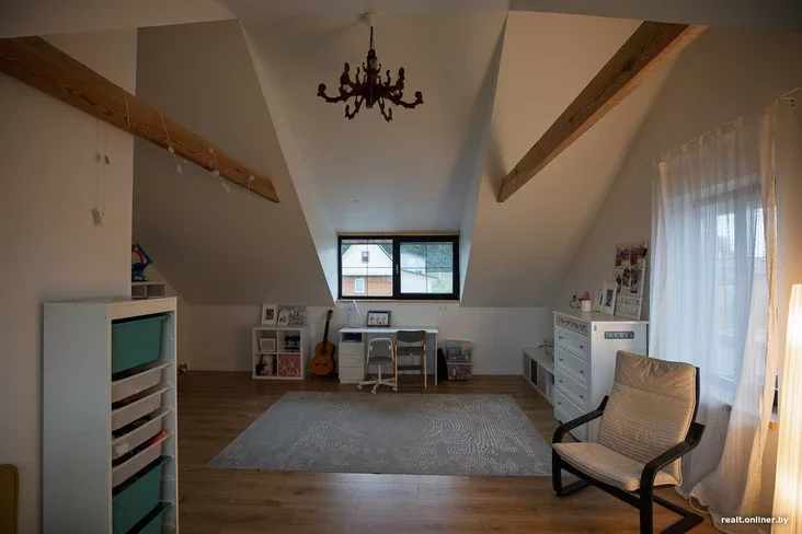 Этаж под крышей полностью отдан детям: в одной комнате (на 30 квадратных метров) обосновались двое сыновей Дмитрия и Натальи, в другой — дочь. Отделённое от взрослого мира пространство находится тут же, в двух шагах от детских комнат. Попасть туда можно, если хорошенько согнуть голову: хозяева здесь малыши, поэтому играть придётся по их правилам.