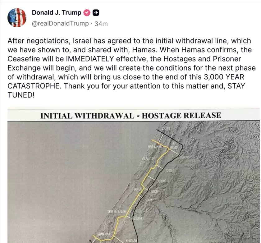 «После переговоров Израиль согласился с первоначальной линией отвода войск, которую мы представили и поделились с ХАМАС. Если ХАМАС подтвердит это, перемирие вступит в силу немедленно, начнется обмен заложниками и заключенными, и мы создадим условия для следующей фазы отвода, которая приблизит нас к завершению этой 3000‑летней катастрофы», — написал Трамп.