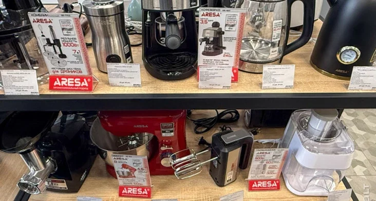 Большинство товаров, представленных в магазине, от «Атлант» — стиральные машины, холодильники, микроволновки, но есть мелкая бытовая техника бренда Aresa. Кроме этого, продаются сковородки и бытовая химия.