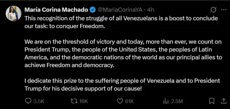 «Я посвящаю эту награду страдающему народу Венесуэлы и президенту Трампу за его решительную поддержку нашего дела!» — написала политик в соцсети X.