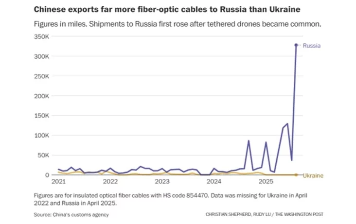 Китай резко увеличил экспорт в Россию ключевых компонентов, необходимых для производства беспилотников, управляемых по оптоволоконному кабелю и нечувствительных к системам РЭБ.