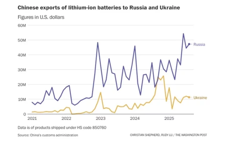 Одновременно резко вырос и экспорт литий-ионных аккумуляторов в Россию, достигнув рекордных 54 миллионов долларов в июне и немного снизившись до 47 миллионов в августе. Эксперты полагают, что эти батареи, скорее всего, использовались в производстве беспилотников, поскольку в России почти не производятся электромобили или другая электроника, где они могли бы понадобиться. В то же время поставки в Украину оставались на уровне 11—12 миллионов долларов в месяц.