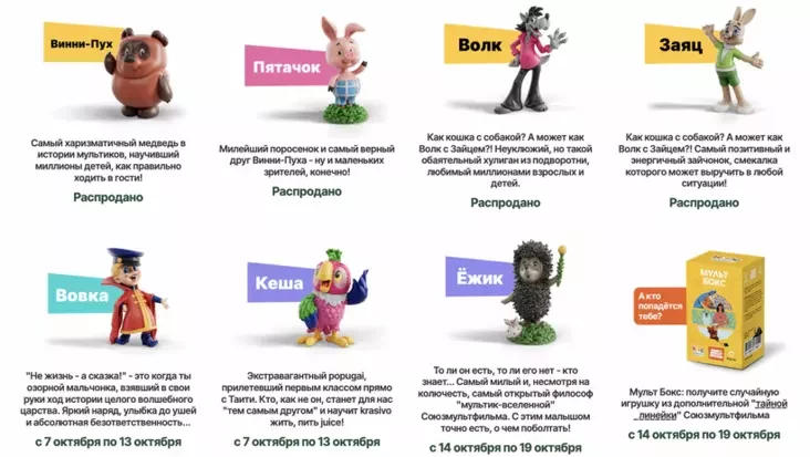 Mak.by запустил лимитированную серию фигурок в сотрудничестве с «Союзмультфильмом». В серию вошли популярные персонажи: Винни-Пух и Пятачок, Волк и Заяц из «Ну, погоди!», ленивый школьник из «Вовки в Тридевятом царстве», попугай Кеша, Ёжик в тумане и другие. Кроме того, была анонсирована «Мульт Бокс» — игрушка из тайной линейки, которая случайно попадается покупателям, пишет Onliner.