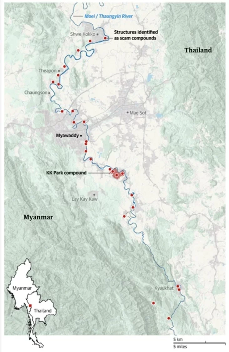 Как пишет The Guardian, после военного переворота в Мьянме в 2021 году количество таких центров на границе с Таиландом увеличилось более чем вдвое — с 11 до 27, причем средний темп расширения составил около 5,5 гектара в месяц. Один из крупнейших таких комплексов — «KK Park» — занимает площадь в 210 гектаров. По оценкам, общее количество работников может составлять до 100 тысяч человек.