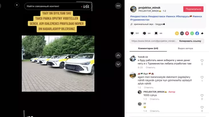 Среди трудовых мигрантов из стран Средней Азии немало таксистов. Их ищут в том числе через социальные сети. Например, можно попасть на аккаунт в тиктоке, который ведется на туркменском и рекламирует работу в такси.
