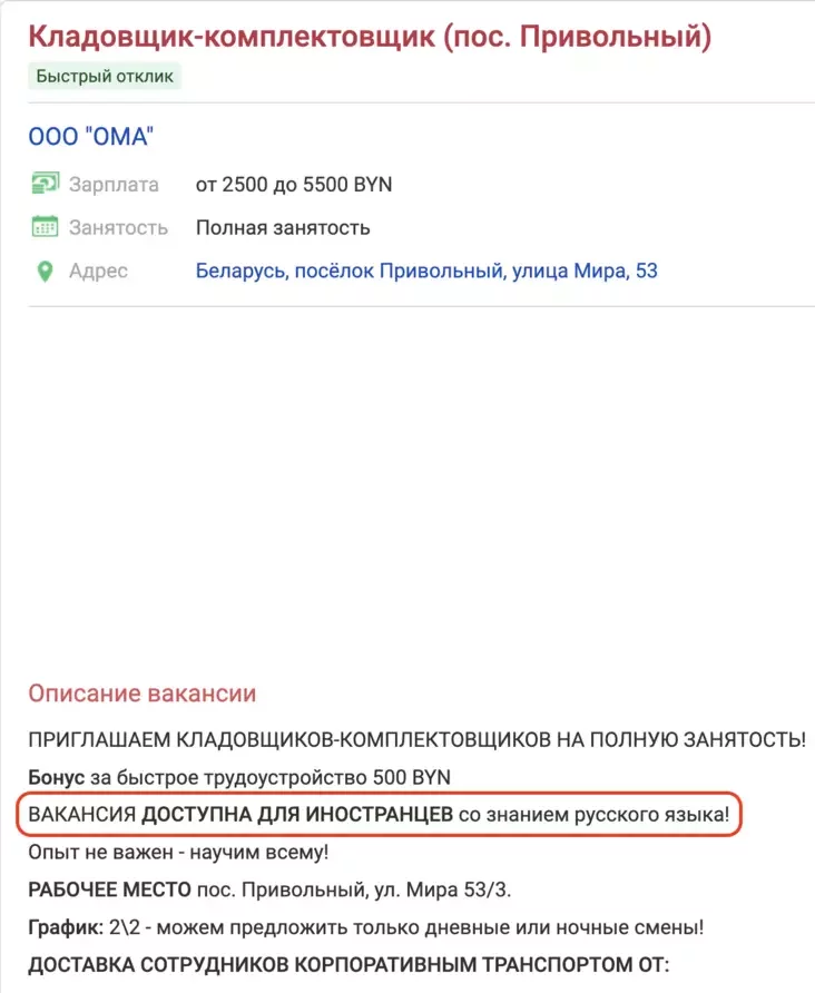 «Вакансия доступна для иностранцев со знанием русского языка», — указано в описании.