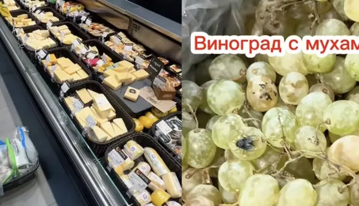 В другом магазине Green в отделе с фруктами нашли гнилую грушу, на прилавке с сырами — просроченные продукты. Работница магазина сказала, что подписана на блогера и попросила отдать ей просроченные сыры. Но не убрала их с прилавка, а изменила маркировку и выложила обратно, сказав, что так можно.
