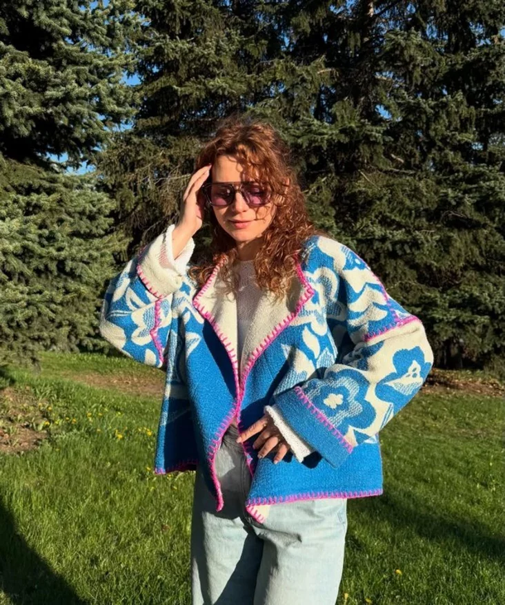 «Я просто серфила по Pinterest, увидела там модель куртки, сделанной из сине-белого покрывала — точно такого, как было у меня в детстве. Я очень люблю яркие, необычные вещи. Да, база в одежде у меня может быть сдержанно-классической, но все равно часто хочется красок. А как раз верхняя одежда так редко бывает такой. Черные, похожие друг на друга пуховики, скучные фасоны — было сложно найти то, что порадует.