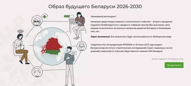 Провластные организации до конца октября проводят новое социологическое исследование на тему образа будущего Беларуси на 2026‑-2030 годы. Принять участие в опросе можно онлайн через сайт меркаванне.бел.