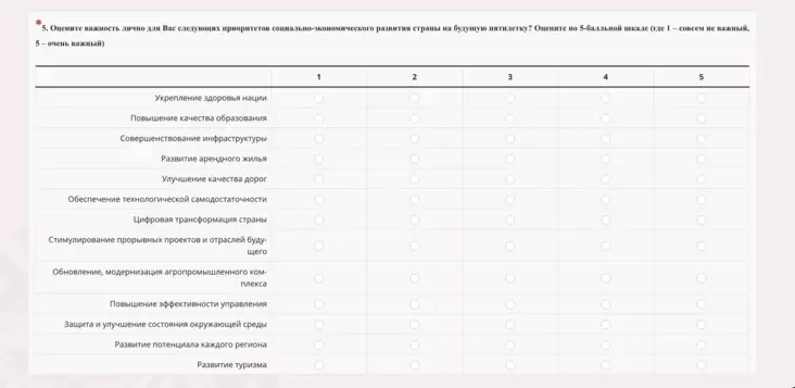 Как и в весеннем опросе, в новом преимущественно собираются мнения насчет экономических составляющих — важность приоритетов социально-экономического развития, лучшие направления регулирования экономики, пути стимулирования занятости трудоспособных граждан, развитие регионов и частного бизнеса.