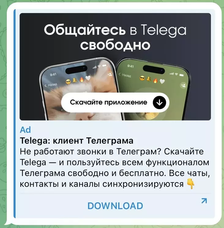 На официальной рекламной платформе Telegram появилась реклама приложения Telega — его позиционируют как альтернативу официальному клиенту мессенджера в России: создатели обещают «работу без ограничений» и возможность звонить без VPN. Как выяснило «Агентство», создатели Telega раньше разрабатывали видеосервис с «ВКонтакте».