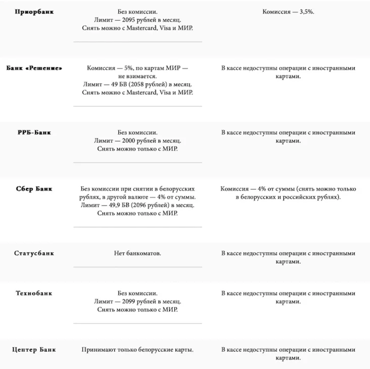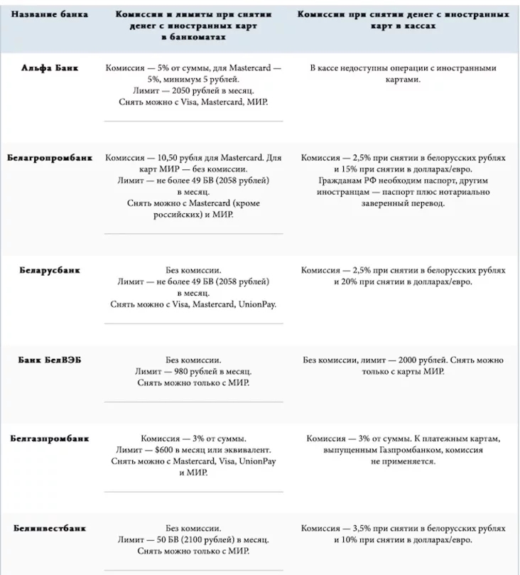 Если необходимо снять более 2100 рублей в месяц, можно обратиться в кассу банка, который проводит операции с иностранными картами (подробнее — в таблице), но везде будет списываться вознаграждение (кроме Банка БелВЭБ) и потребуется паспорт.