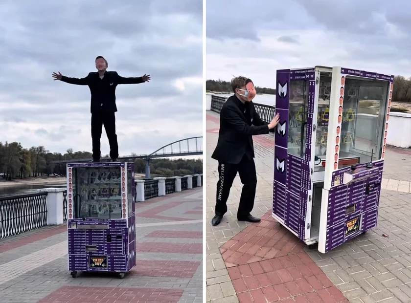 Участник челленджа Мелстроя притолкал на набережную в Гомеле автомат с игрушками и взобрался на него. Им заинтересовались силовики