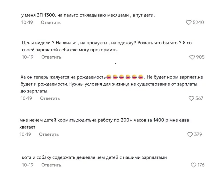 Самыми многочисленными и залайканными стали комментарии, посвященные финансовому аспекту жизни. Пользователи подчеркивают, что зарплата позволяет только существовать, но не жить, и уж тем более не воспитывать детей.