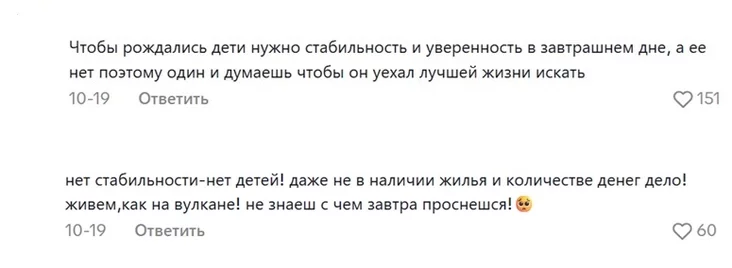 «Нет стабильности — нет детей! Даже не в наличии жилья и количестве денег дело! Живем как на вулкане! Не знаешь, с чем завтра проснешься!»