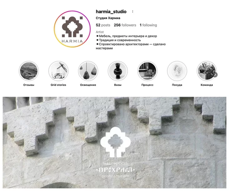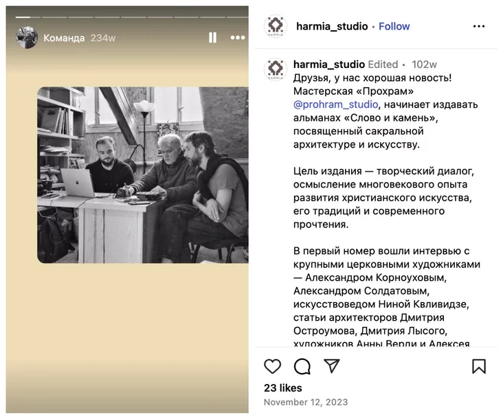 Разгадка смены направления деятельности кроется в том, что «Хармиа» является дочерней компанией архитектурной мастерской «Прохрам», базирующейся в Москве и активно занимающейся проектированием православных храмов. На эту связь указывают одинаковые логотипы у обеих студий, а также неоднократные упоминания и фотографии в соцсетях «Хармиа» с архитектором Дмитрием Остроумовым — без уточнения его роли. Судя по сайту «Прохрам», белорусская студия производит созданные в московской мастерской объекты, выступая, так сказать, ее производственным участком.