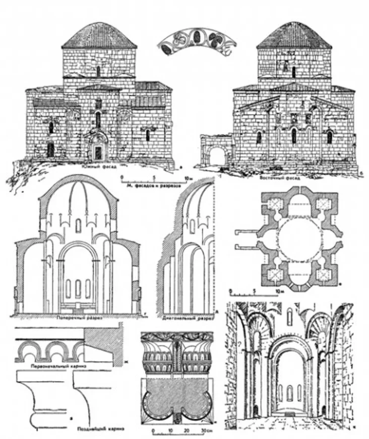 Крестово-купольный храм в плане прямоугольный (25,1 × 19,7 м) с тремя гранеными выступами — боковыми выходами и апсидой, что отсылает к крестово-купольной форме грузинского храма, который имел апсиды с каждой из четырех сторон. На главном фасаде аркадная галерея. Храм перекрыт наклонной черепичной крышей, а над центральной частью поставлен восьмигранный барабан, завершенный шлемовидным куполом.