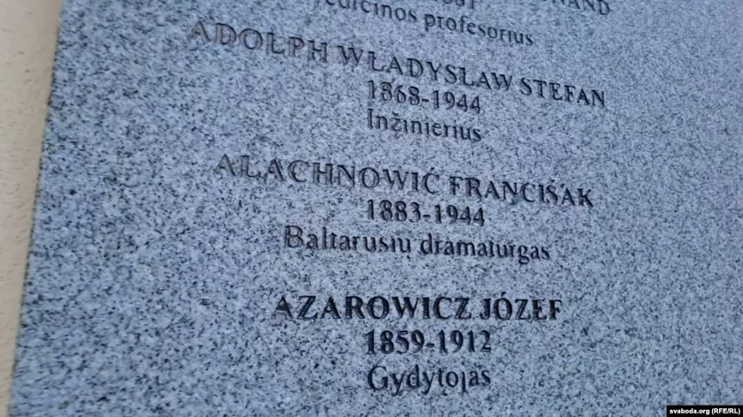 «Олехнович Франтишек. 1883—1944. Белорусский драматург» — написано по-литовски на базальтовой доске. Кроме Олехновича на доске указаны еще 29 фамилий.