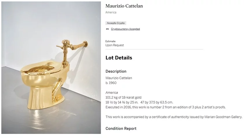 Аукционный дом Sotheby’s планирует начать торги по продаже золотого унитаза художника Маурицио Каттелана. Художественное произведение перед продажей будет выставлено в штаб-квартире аукционного дома, чтобы покупатели могли протестировать его. Начальная цена — 10 миллионов долларов.