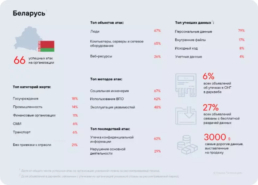 Согласно исследованию, во второй половине 2024 года и в течение первых трех кварталов 2025‑го на белорусские организации пришлось около 9% всех успешных кибератак в СНГ. Безусловный лидер здесь Россия, на которую пришлось 72%, на Казахстан — 7%.