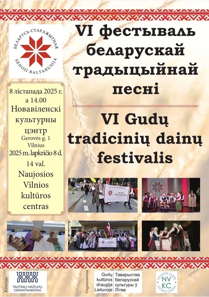 8 ноября в Культурном центре в Новой Вильне (Gerovės g.) состоится 6‑й фестиваль «Беларусь древняя». Там соберутся белорусские, литовские, польские, латышские, украинские фольклорные группы, чтобы зрителям продемонстрировать свою традиционную этническую культуру.