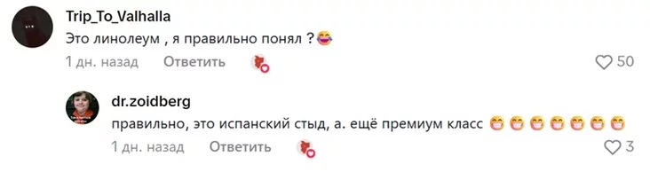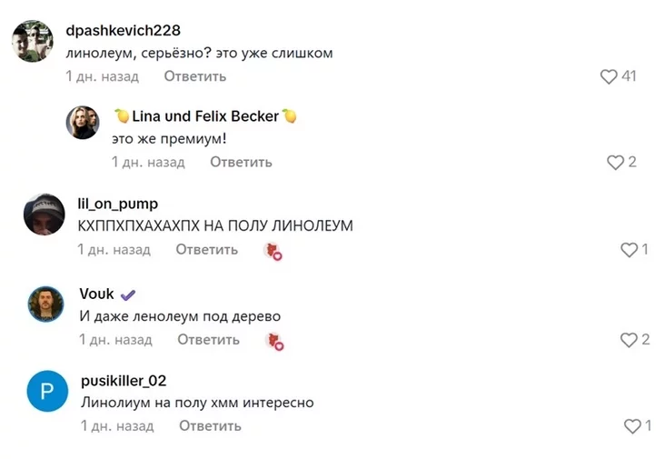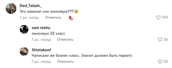 Наибольшее количество лайков (почти 760) набрал комментарий-вопрос: «Это ламинат или линолеум?»