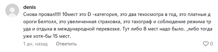 «Снова провал!!!! 10 мест — это D-категория, это два техосмотра в год, это платные дороги, это увеличенная страховка, это тахограф и соблюдение режима труда и отдыха при международной перевозке. Тут или 8 мест надо было, или тогда уж хотя бы 15 мест», — компетентно замечает один из зрителей.