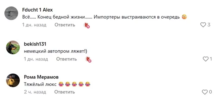 Люди шутят: «Все… Конец бедной жизни…. Импортеры выстраиваются в очередь», «Немецкий автопром ляжет!», «Тяжелый люкс».
