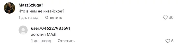 «Что в нем не китайское?» — спрашивает кто-то. Ему отвечают: «Логотип МАЗ!».