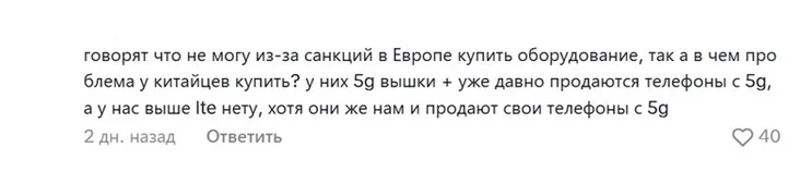 «Говорят, что не могут из-за санкций в Европе купить оборудование, так в чем проблема у китайцев купить? У них 5G-вышки уже давно продаются, и телефоны с 5G, а у нас выше LTE нету, хотя они же нам и продают свои телефоны с 5G».