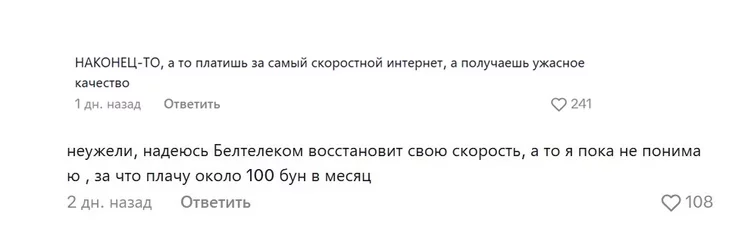 «Неужели, надеюсь, Белтелеком восстановит свою скорость, а то я пока не понимаю, за что плачу около 100 рублей в месяц».