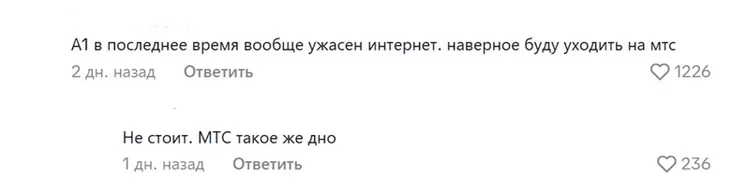 «А1 в последнее время вообще ужасный интернет. Наверное, буду уходить на МТС», — написал один из зрителей и получил ответ: