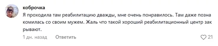 «Я проходила там реабилитацию дважды, мне очень понравилось. Там даже познакомилась со своим мужем. Жаль, что такой хороший реабилитационный центр закрывают».