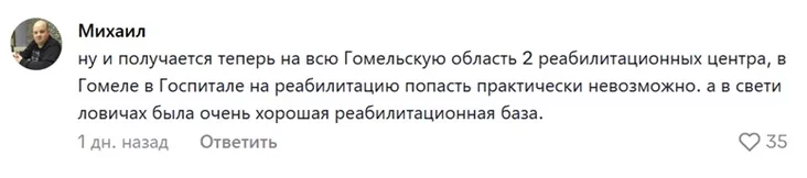 «Ну и получается теперь на всю Гомельскую область 2 реабилитационных центра. В Гомеле в Госпитале на реабилитацию попасть практически невозможно. А в Светиловичах была очень хорошая реабилитационная база».
