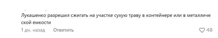 А один зритель утверждает, что «Лукашенко разрешил сжигать на участке сухую траву в контейнере или в металлической емкости». Но это неправда.