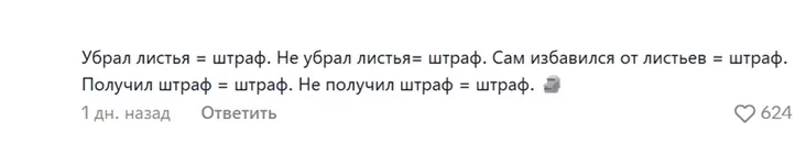 «Убрал листья = штраф. Не убрал листья = штраф. Сам избавился от листьев = штраф. Получил штраф = штраф. Не получил штраф = штраф», — подытоживает реальность другой. И его поддержали более 620 зрителей.
