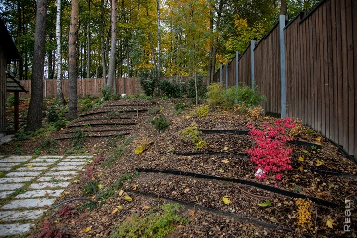 — Подпорные стенки были бы здесь кощунством, причем дорогим кощунством — тысяч сорок долларов, как минимум, — объясняет Павел. — Алексей был против них категорически — он просил сохранил природную естественность. Поэтому стенки ярусов мы укрепили следующим образом: положили сетку от кротов, потом георешетку. В ячейки засыпали грунт, высадили почвопокровные растения, замульчировали корой. Чтобы посадки хорошо укоренились и не пересыхали летом, по всему участку проложена система капельного полива. Вот уже третий год пошел — все держится, не сползает. В скором времени высаженные растения разрастутся и вместе с корой скроют пока что видимые пластиковые бортики. Прополки редкие — в этом году был только одна (химпрополка). Хотя в первый год было сложнее — в привозном грунте, более питательном чем родном лесном, очень хорошо почувствовала себя сныть — начала забивать все высаженное. От этого сорняка еле избавились.