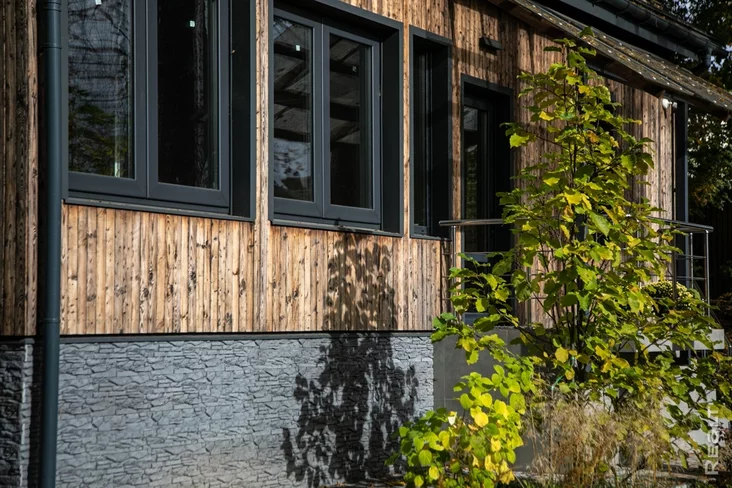Вагонку на фасаде реанимировать не было смысла, решено было заменить новой обшивкой. Заодно и деревянные стены утеплили, укрепили. В качестве обшивки использовалась обычная доска с выбранной «четвертью» (доски имеют специальные выступы с торцов, таким образом происходит нахлёст). Но, благодаря тому, что ее предварительно обожгли, зачистили от золы и покрыли маслом, выглядит фасад весьма оригинально и благородно. Красить его не нужно — со временем он лишь «поседеет». Берите решение на заметку — фасад обошелся всего в 4 тысячи рублей.