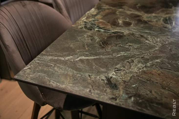 Большой обеденный стол в гостиной с первого взгляда кажется массивным и монолитным благодаря гранитной столешнице. Но при ближайшем рассмотрении гранитом оказалась широкоформатная керамогранитная плитка, приклеенная к деревянному основанию.
