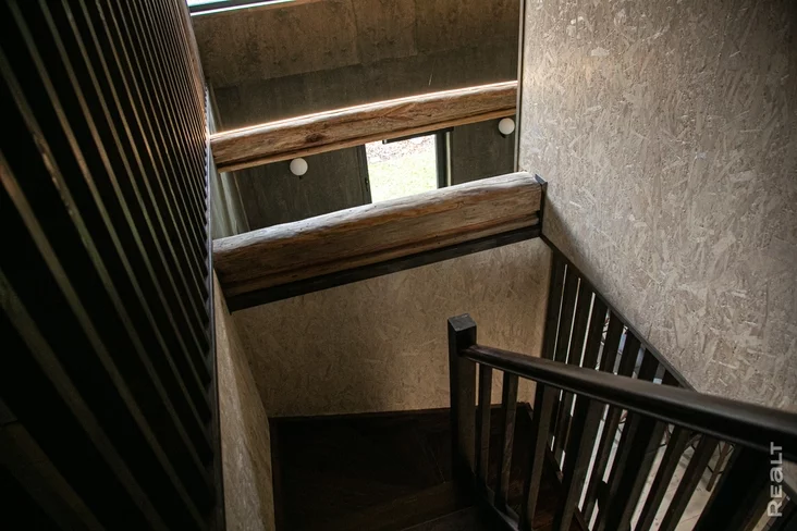 В интерьере мы видим рациональный подход к обустройству. Для отделки использовались практичные и недорогие материалы и решения. Например, стены в спальнях обшили вагонкой, в остальных помещениях — фанерой. Лестница простая, деревянная, но со своей главной функцией справляется.