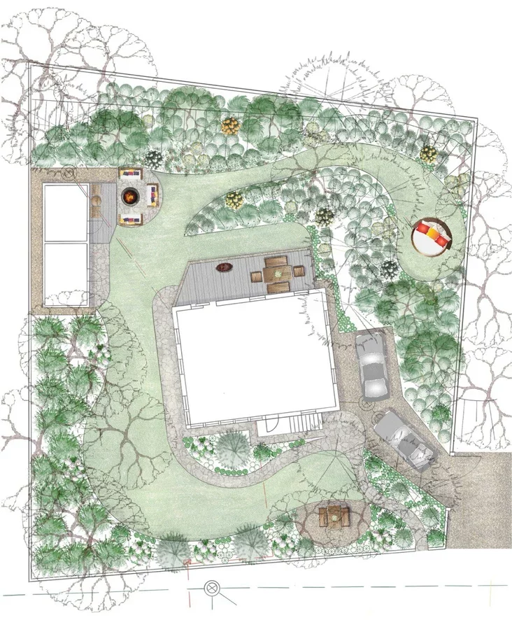 — Запрос от Алексея и его супруги был такой: максимум зелени, место под баню и хозпостройку, возле въезда на участок — стол и лавочку, чтоб чистить грибы (пока не реализовано), расположить где-то зону уединения, продумать дорожно-тропиночную сеть, — рассказывает она. — Из неординарных запросов — предусмотреть возможность кататься зимой на санках. И всё это в условиях узкого коридорного подъезда к участку и большого количества взрослых деревьев на въезде и на самом участке.