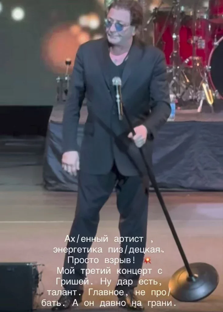 В инстаграме женщина поделилась впечатлениями: «О**енный артист, энергия просто пи***ецкая. Просто взрыв! Мой третий концерт Гриши. Ну дар есть, талант. Главное, не пр**бать. А он давно на грани».